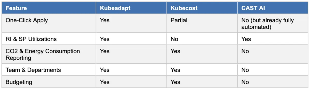When evaluating Kubernetes cost optimization tools, CAST AI and Kubecost are often part of the conversation. Each is a capable platform, but their underlying approaches reflect fundamentally different philosophies. For transparency, here is a comparison of key features across Kubeadapt and these solutions: